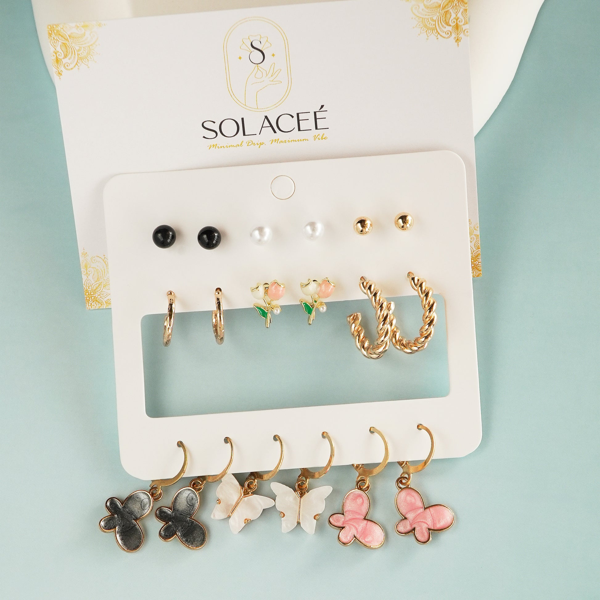 For the ones who bloom with grace and flutter with freedom 🦋. The Butterfly Bloom – 9 Pair Combo is a whimsical mix of butterflies, roses, pearls, golden hoops, and minimal studs.
